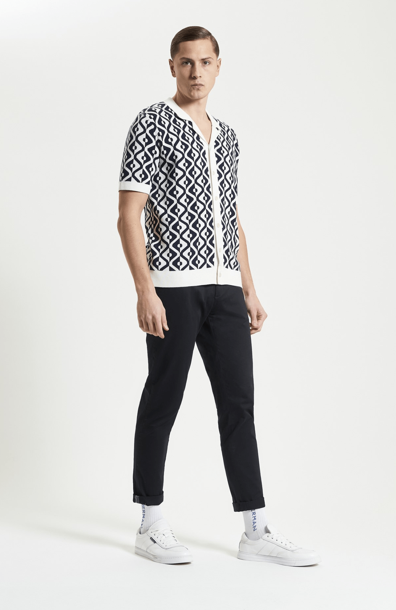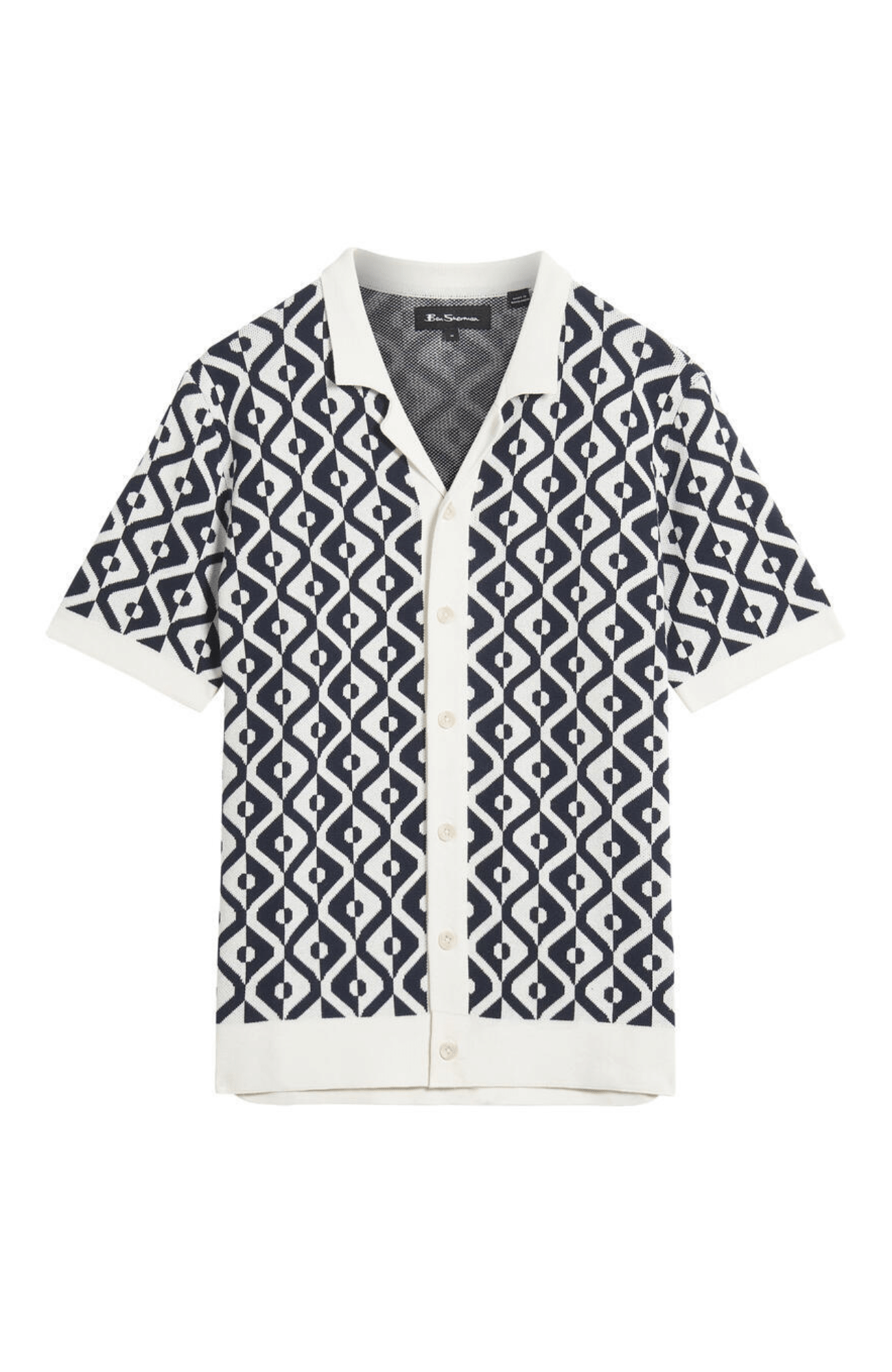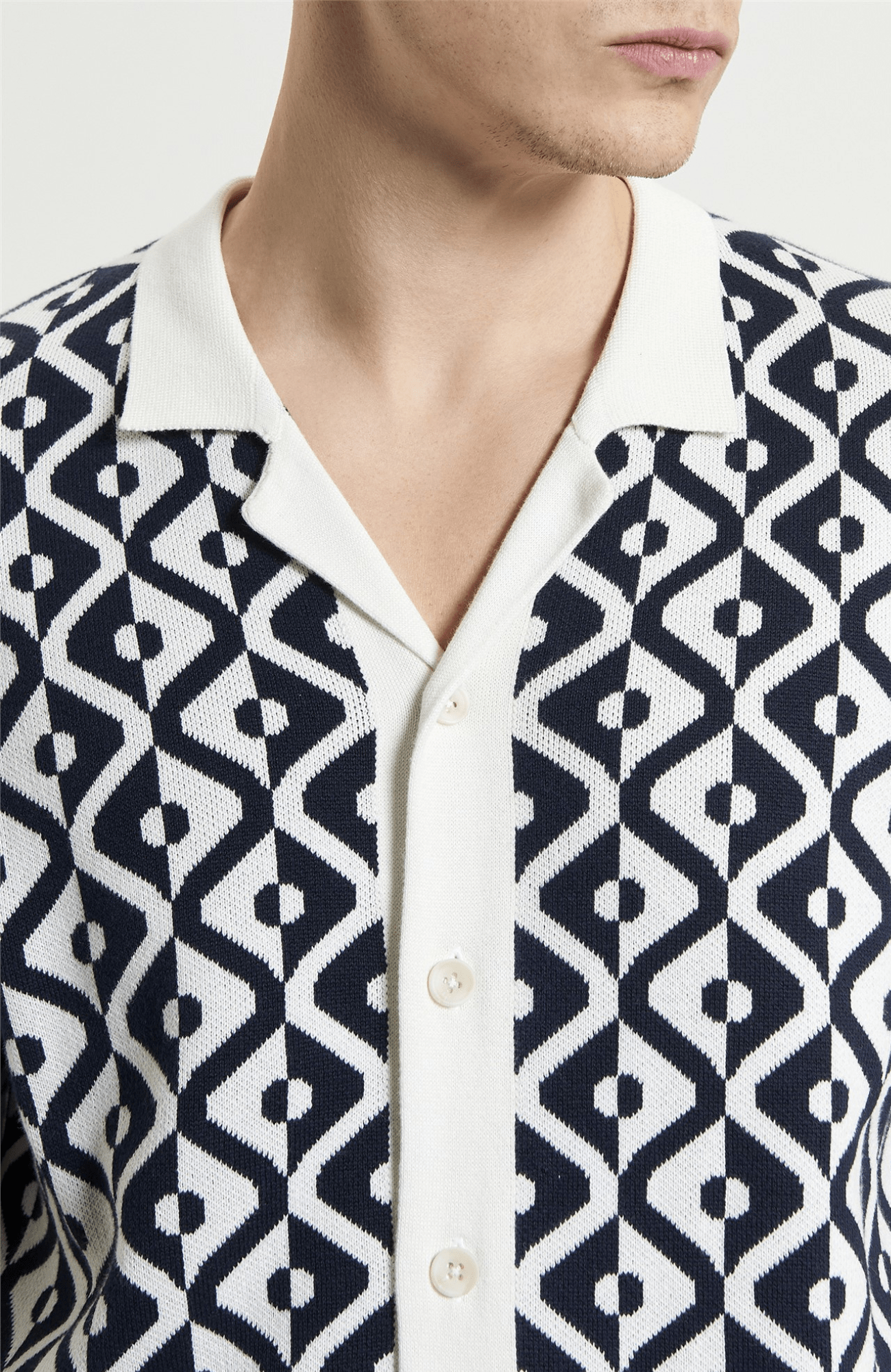 This short sleeve knitted tile jacquard resort shirt features a button through placket and a branded woven label at the side seam. A regular fit, made from 100% cotton
